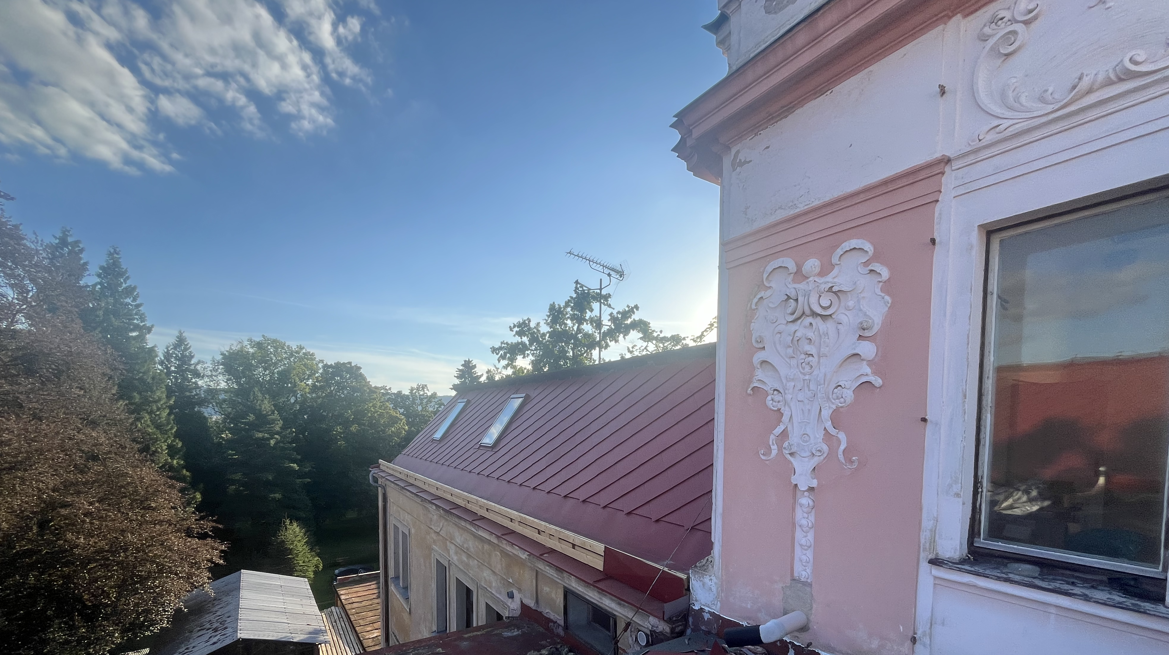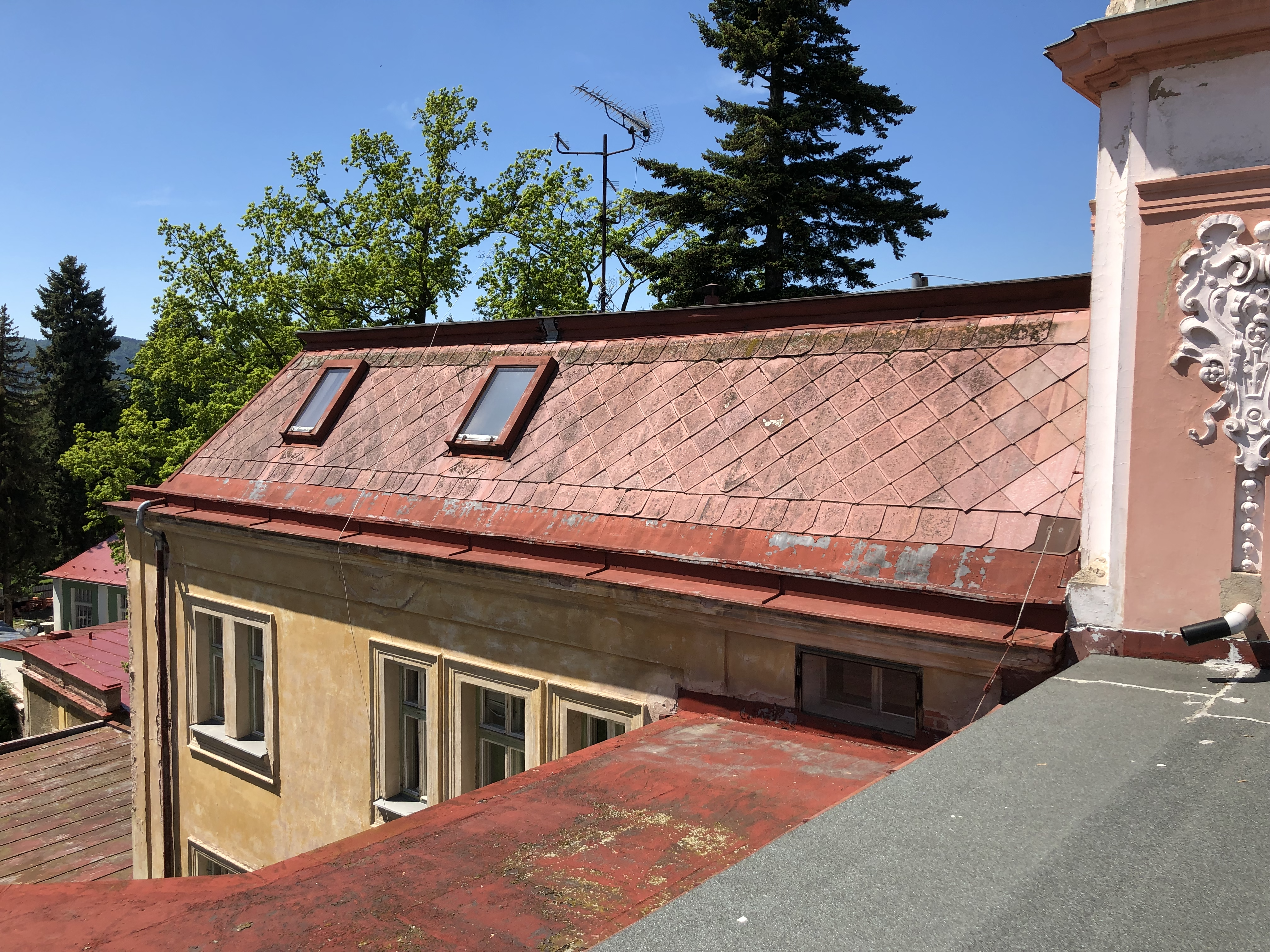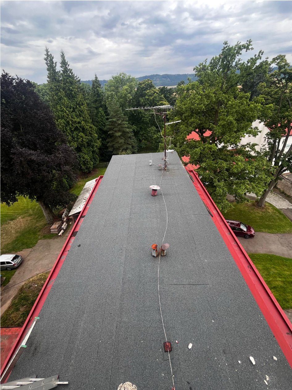 Dříve občasné „zalepení“ jen lokálních částí střechy nemohlo mít dlouhodobý účinek Vlastník nemovitosti – ETIC s.r.o. díky přístupu nových majitelů rozhodl o rázném řešení dloouhodobě neřešeného problému, a tedy ke kompletní obnově celého střešního pláště této krásné nemovitosti. Vzhledem k velké finanční náročnosti celé revitalizace bylo nutno projekt rozdělit na více částí. V průběhu roku 2024 byla zrealizována II. etapa. a to obnova střešního pláště tzv. přístavby budovy.